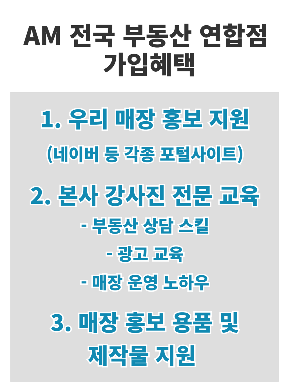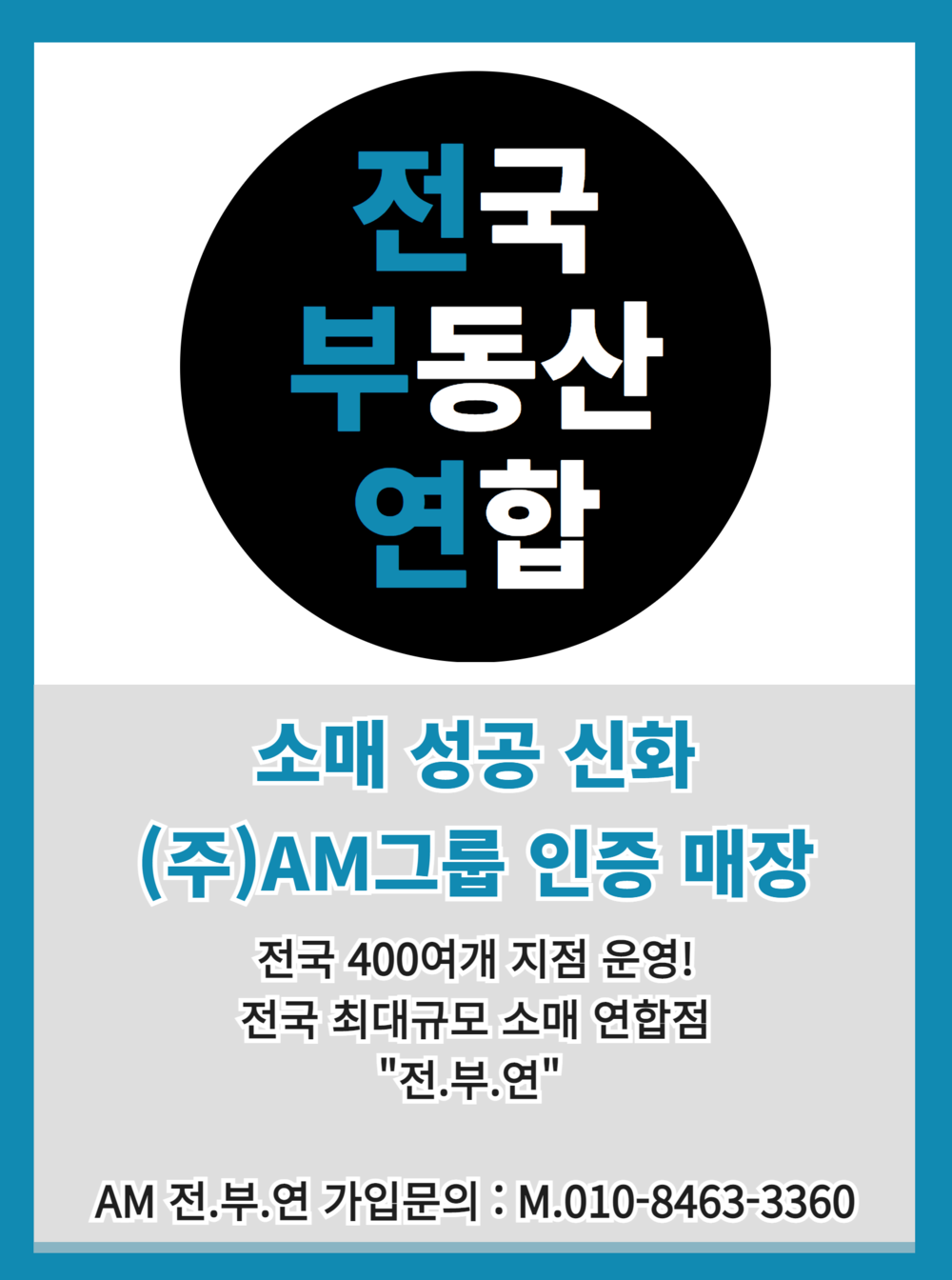 (주) 에이엠그룹의 22년 1월 전국 부동산 연합점 "전.부.연"이 런칭하게 되었습니다. AM 부동산 연합점은 공인 중개사의 연합점이며, 에이엠그룹 직접 관리를 담당하고 있습니다.